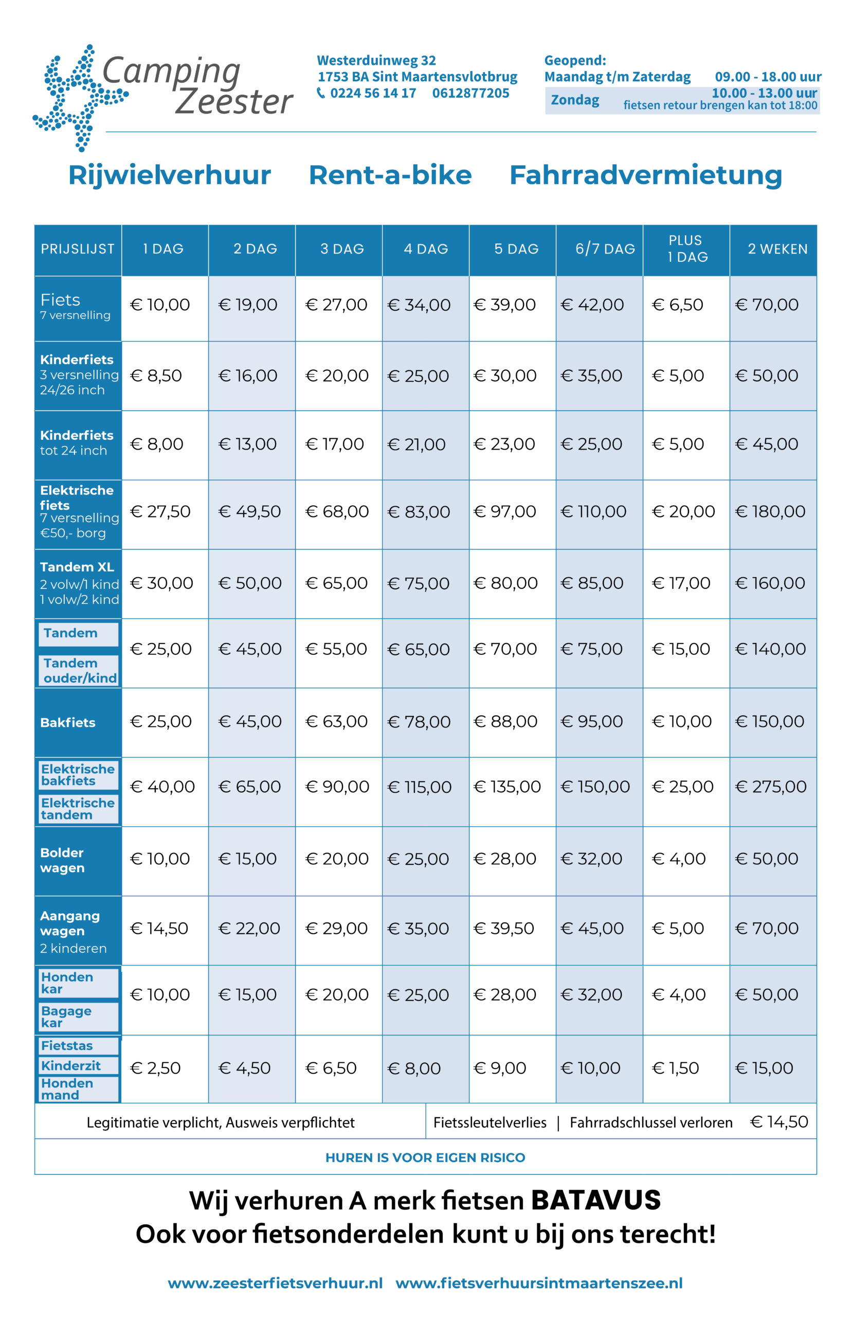 Ook voor een aanhangwagen, een bolderwagen, een hondenwagen, een kinderzitje, een fietstas en een windscherm bent u bij ons aan het goede adres. Wij werken alleen met A-merken fietsen van o.a. batavus van maximaal twee jaar oud; elk najaar verkopen wij ons hele assortiment. Een verhuurdag loopt van 9.00 tot 18.00 uur.